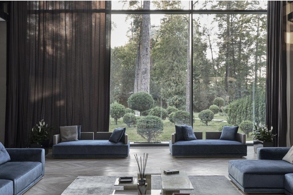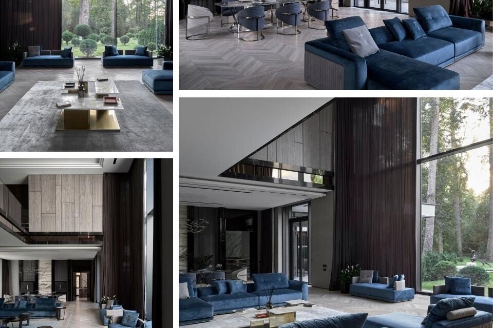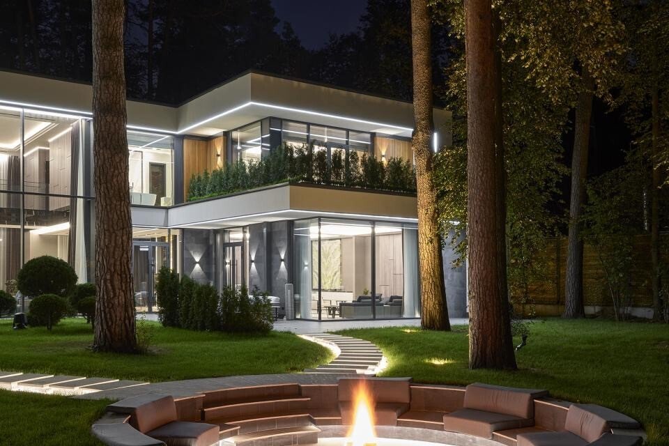 Экстерьер и интерьер четырехуровневого особняка выполнен с применением ультрасовременных технологий строительства и инженерных систем. Архитектурный стиль вносит в интерьер ощущение света и пространства, акцентирует внимание на форме и фактуре деталей и предметов интерьера. Интерьер загородного дома отличается простотой и четкостью форм, заключая в себе легкость конструкций, удобство использования и функциональность.