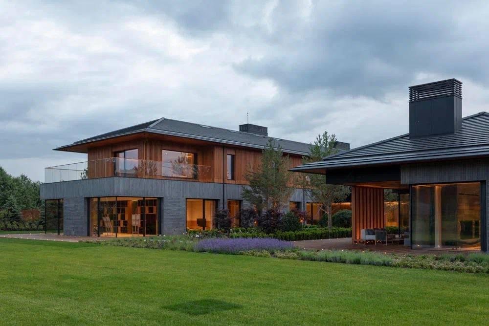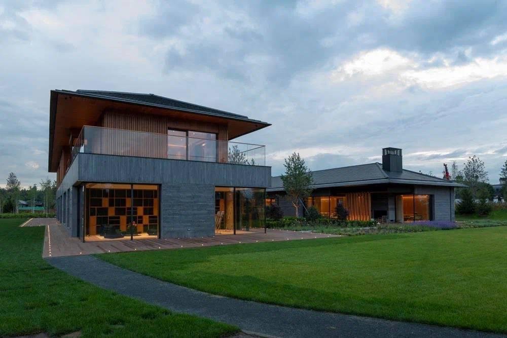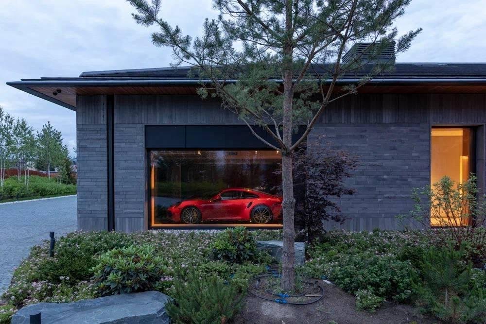 Конфигурация дома подразумевает максимальное количество света и создаётся графикой окон с панорамным остеклением, продуманным распределением окон и раздвижных дверей с минимальным количеством перегородок.