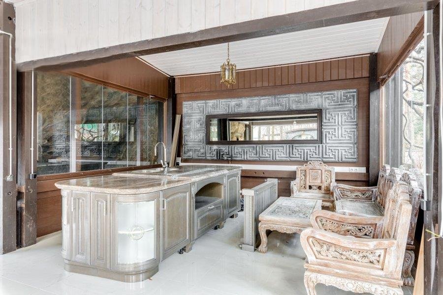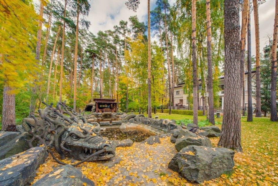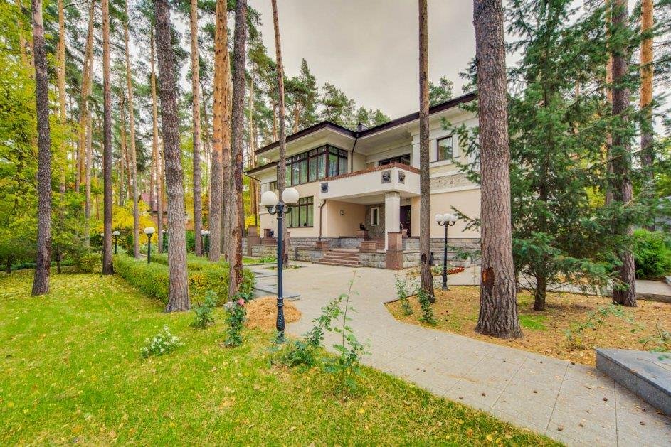 Стильный дом 800 кв.м в поселке ДСК Лес Жуковка. Дом полностью меблирован и готов к проживанию. На лесном участке 45 сот. с корабельными соснами участке выполнены ландшафтные работы, организован пруд с декоративными элементами в восточном стиле, беседка с зоной барбекю, вымощены дорожки, установлено освещение.