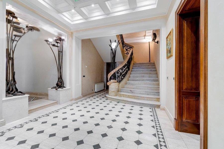 2 этаж: холл, спальня, ванная комната (гидромассажная ванна и душевая кабина), спортзал, двусветная библиотека, спальня с ванной комнатой (гидромассажная ванна и душевая кабина) и гардеробной, мастер-спальня с выходом на террасу, камином, гардеробной и ванной комнатой (гидромассажная ванна и душевая кабина).