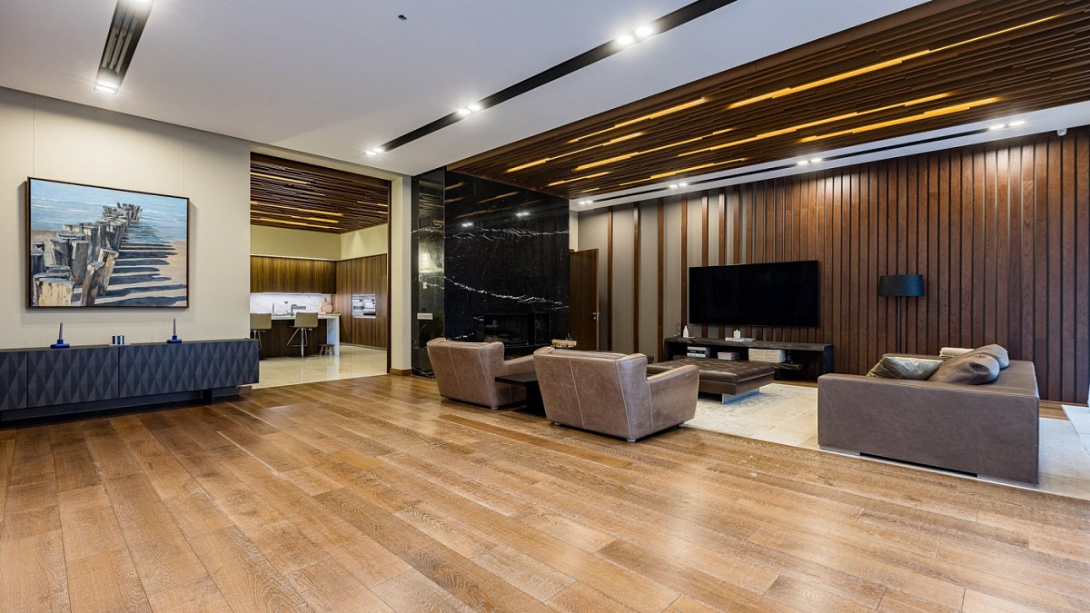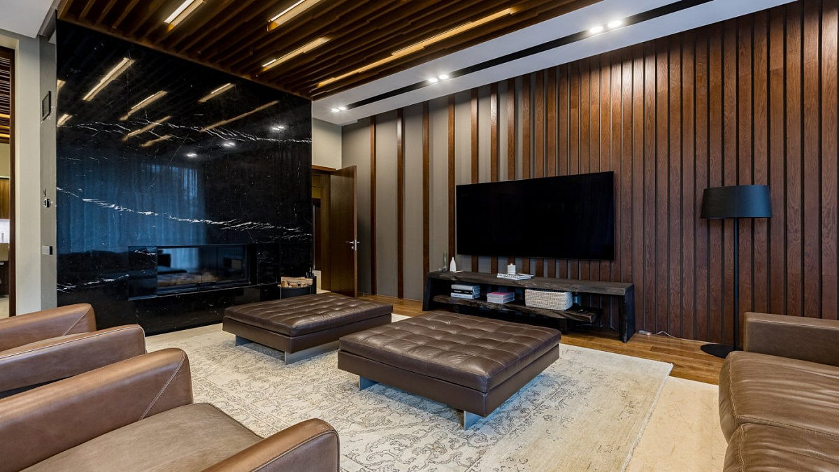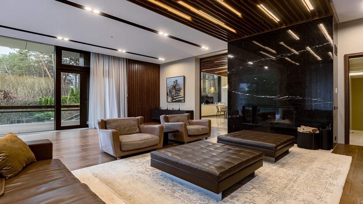 1 этаж: холл, кабинет, с/у, гардероб, гостиная с камином и выходом на большую террасу с барбекю, кухня, столовая.