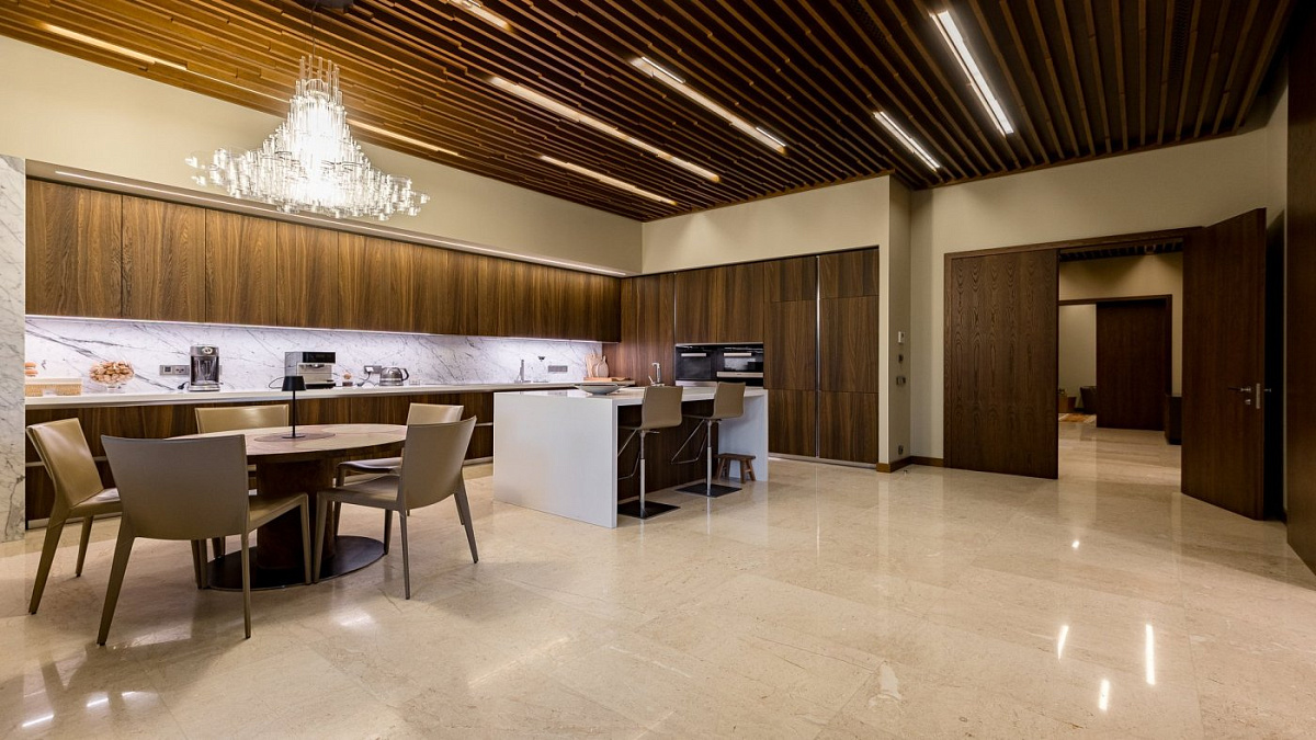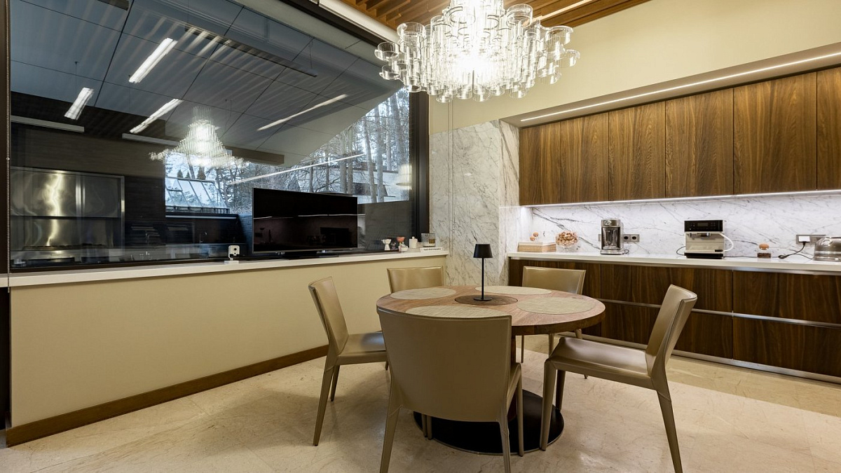 Цокольный этаж: квартира для персонала (2 комнаты, с/у, кухня); детская игровая, постирочная, спортзал, лифт, гараж на 2 машины, котельная, техническая комната.