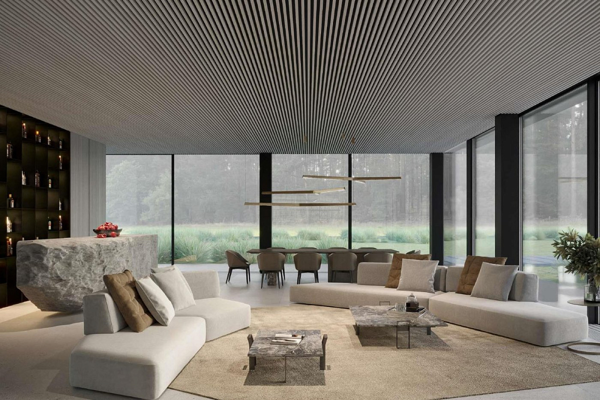 В концепции экстерьера выдержана четкая геометрия форм. Силуэт сочетает в себе строгие формы и притягательный уют. Цветовая гамма фасада из натурального Португальского камня и дерева идеально гармонирует с ландшафтом. А за открытость отвечает принцип его расположения на участке и единение с окружающей средой, а также панорамные окна по всему дому с уникальной раздвижной системой с максимально тонким алюминиевым профилем.