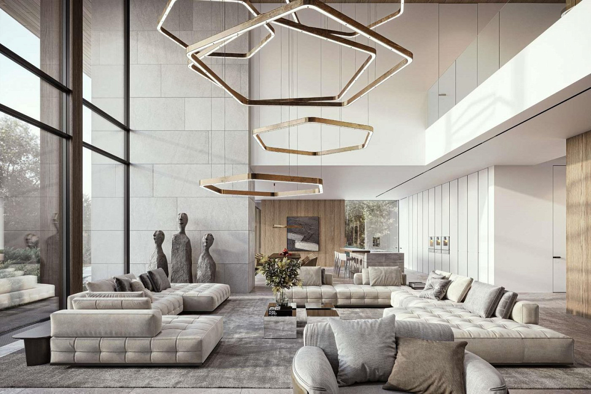 Два уровня, бассейн 15x5 м, SPA-зона, лифт, 5 спален с гардеробными и ванными комнатами, камин, обособленный блок персонала. Высокие потолки до 4,2 метра. Большое панорамное остекление со вторым светом. Парковка на 5 м/м.
