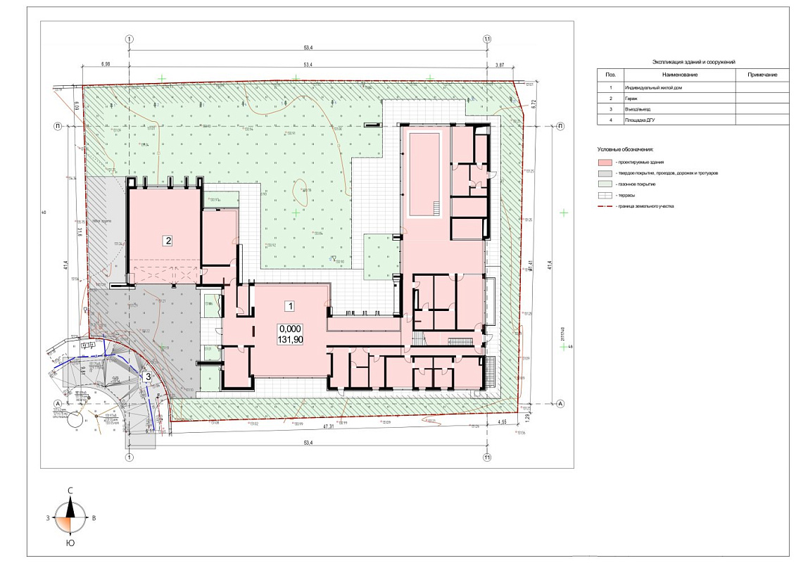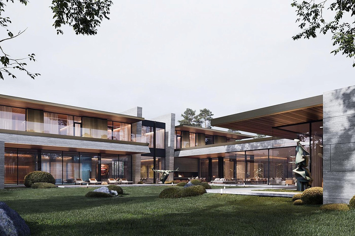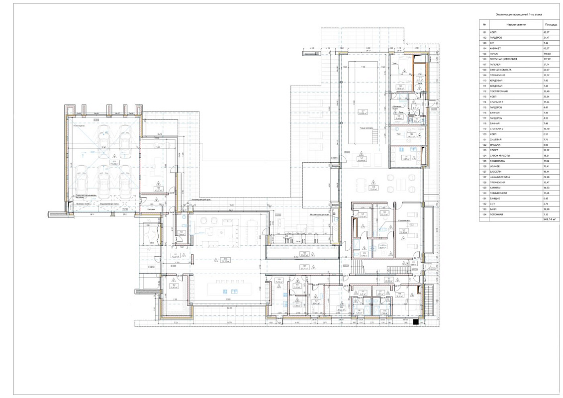 1 этаж: прихожая, гардеробная, с/у, кабинет, гараж на 2 м/м, холл, гостиная - столовая со вторым светом, винная комната, кладовые, рабочая кухня, постирочная, котельная, 2 спальни с с/у и гардеробными, СПА зона: бассейн, хамам, сауна, душевая, массажная, салон, кухня,