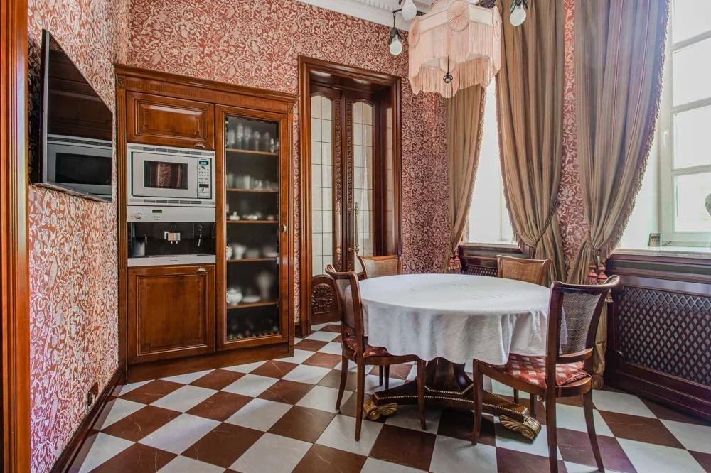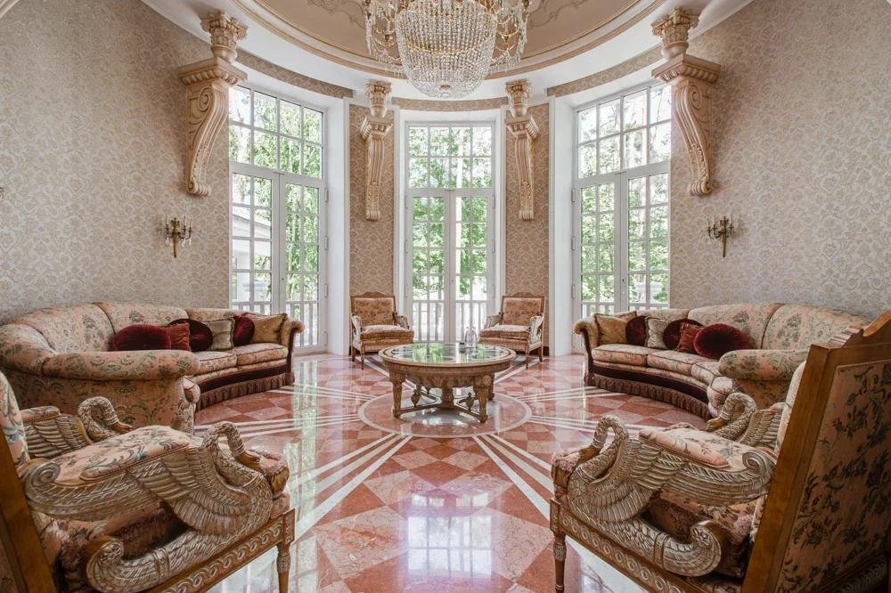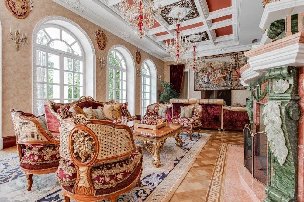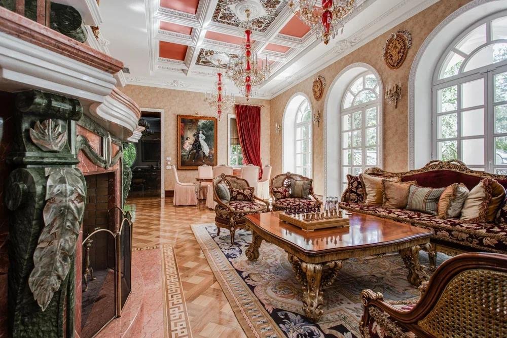 1 этаж: холл, санузел, гардеробная, диванная, гостиная 82 кв. м с камином, парадная столовая, малая столовая, кухня, гостевая спальня с ванной комнатой,