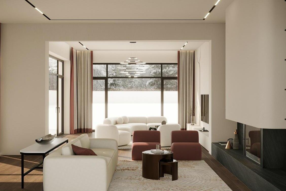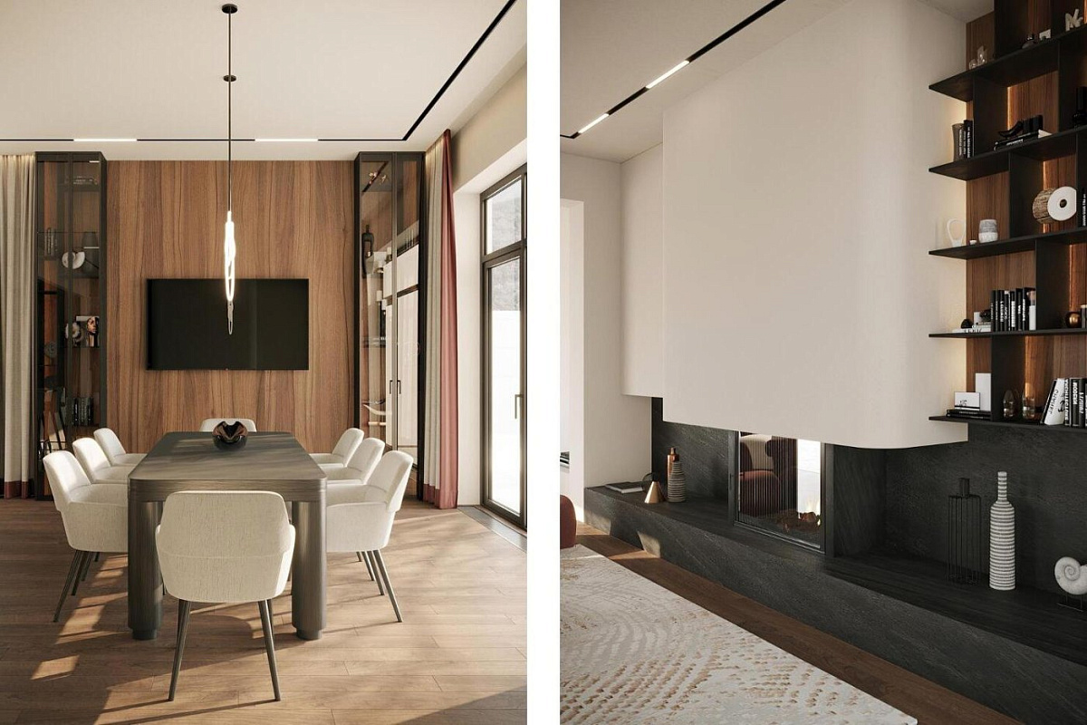 1 этаж: холл с вторым светом, кухня-гостиная-столовая с камином, малая гостиная, рабочая кухня, спальня с с/у, гостевой с/у, СПА-зона (бассейн, сауна, с/у), Beauty Room, кладовая, котельная, гараж на 2 автомобиля.