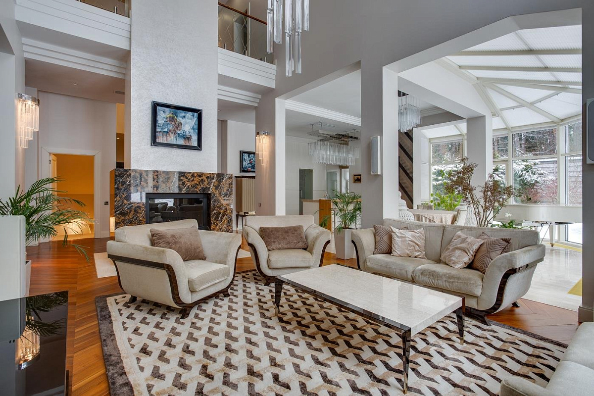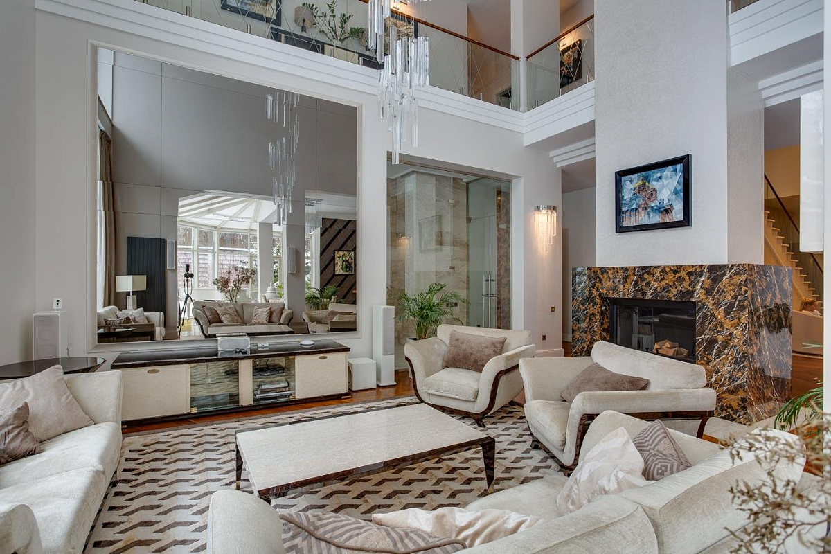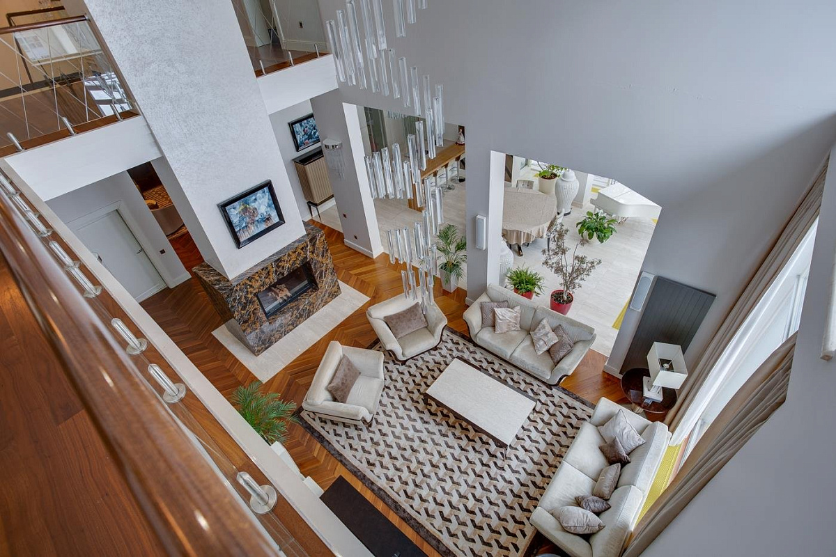 1 этаж: холл, гостевой с/у, гардеробная, большая двусветная гостиная с камином и роялем, кухня, кухню, столовая, тренажерный зал, SPA- зона с бассейном, сауной и хамамом; 2 спальни с индивидуальными ванными и гардеробными;