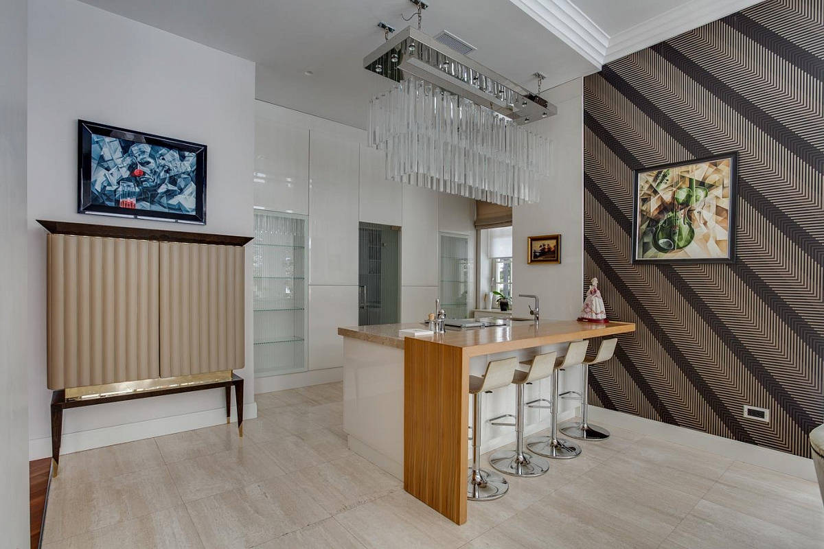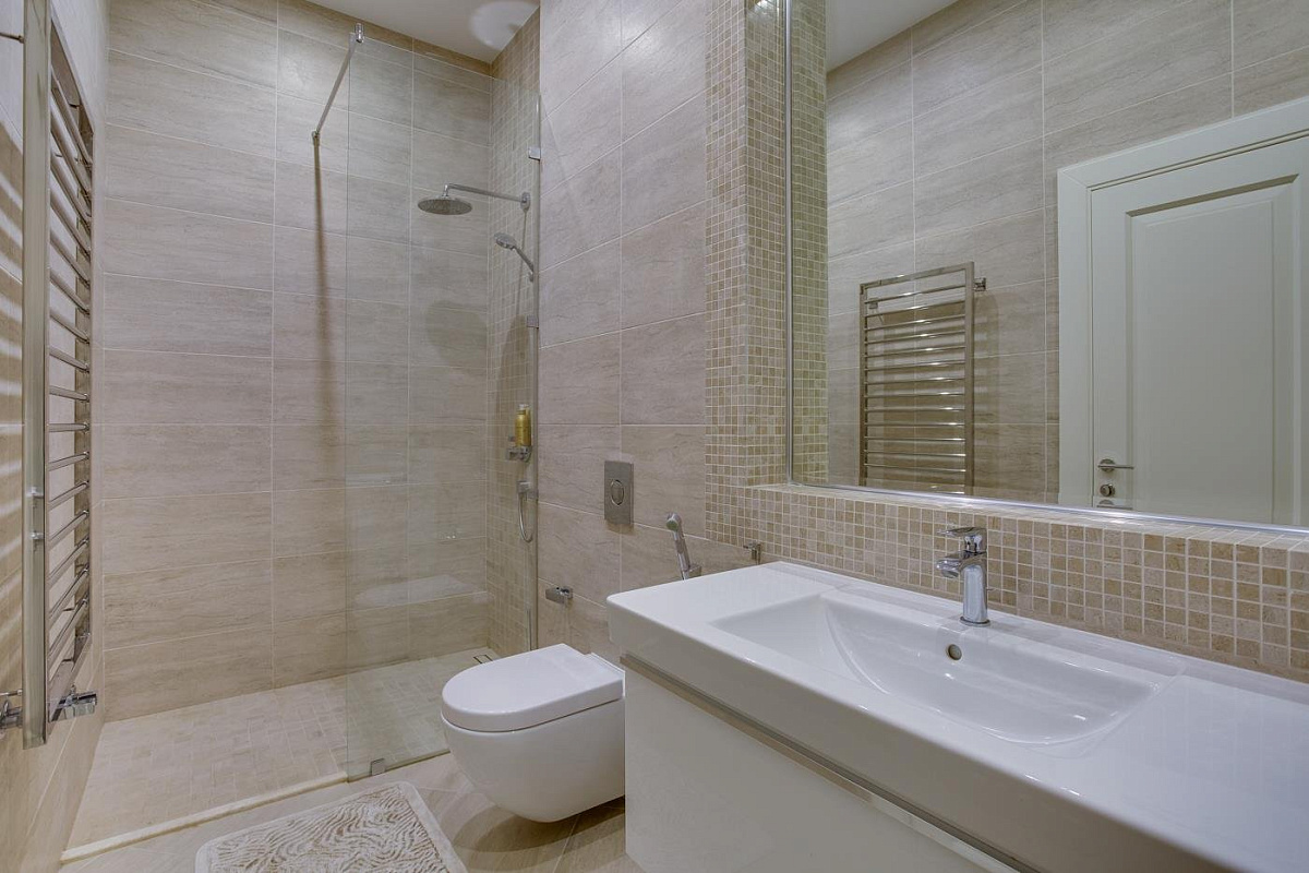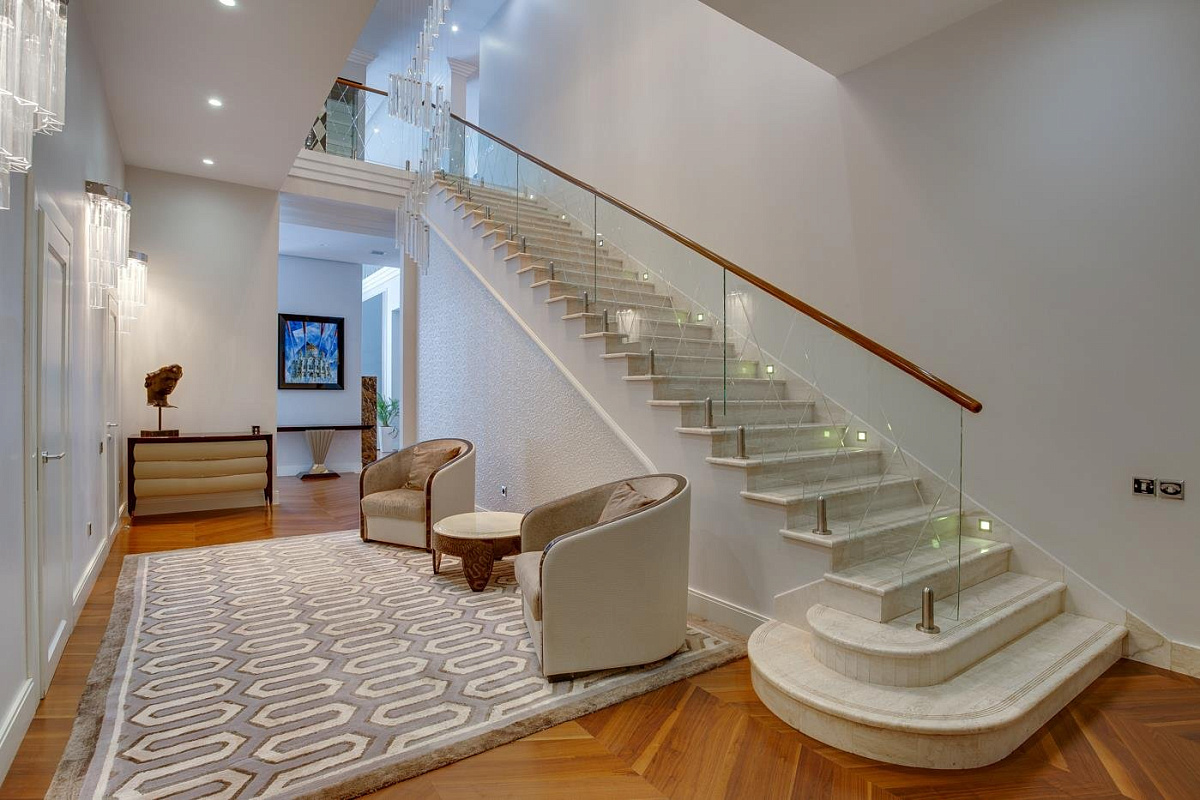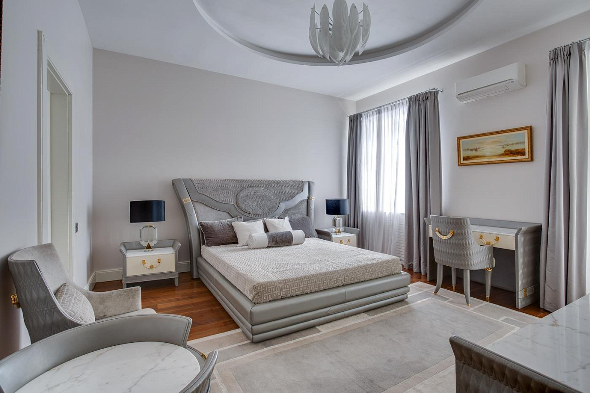 1 этаж: холл, гостевой с/у, гардеробная, большая двусветная гостиная с камином и роялем, кухня, кухню, столовая, тренажерный зал, SPA- зона с бассейном, сауной и хамамом; 2 спальни с индивидуальными ванными и гардеробными;