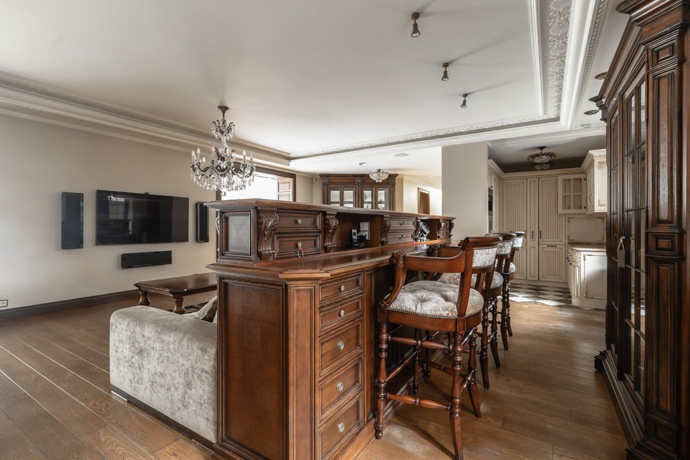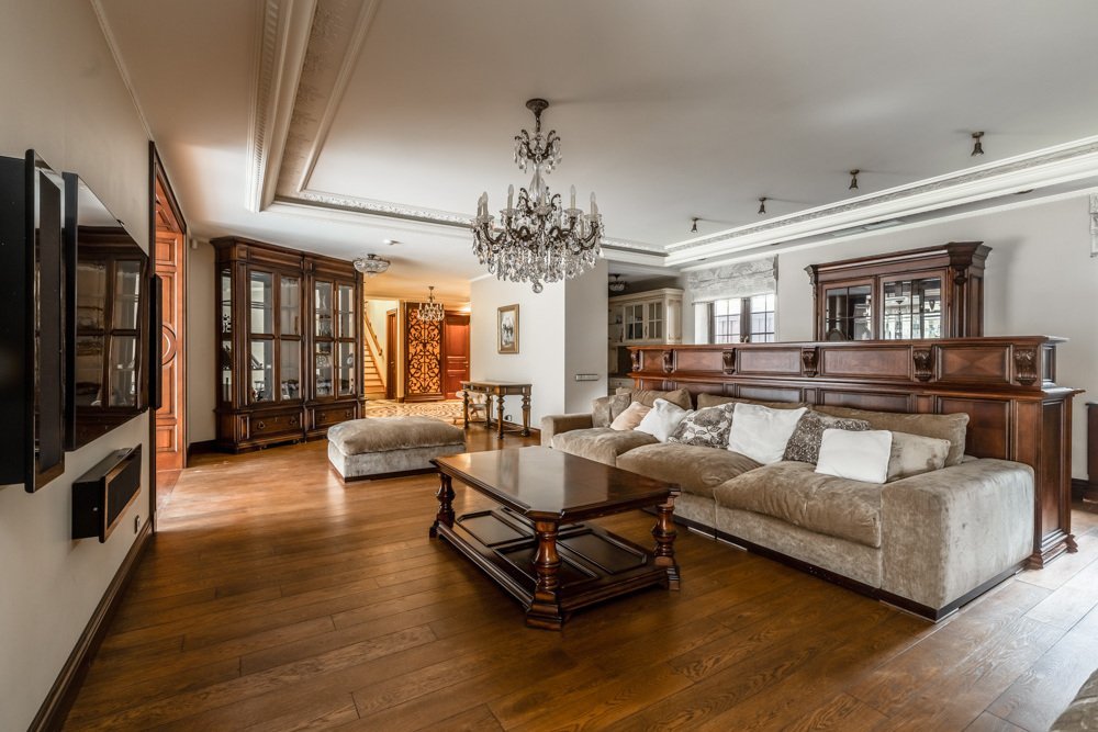 Резиденция "под ключ" с бассейном на просторном живописном участке, в окружении соснового бора, расположена на тихой обжитой улице Жуковки. Интерьер выполнен в стиле английской классики: используются дорогие натуральные материалы отделки (дерево, камень), благородные оттенки, вся мебель от итальянских знаменитых фабрик.